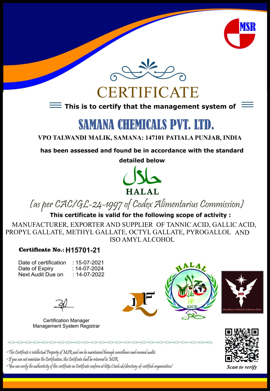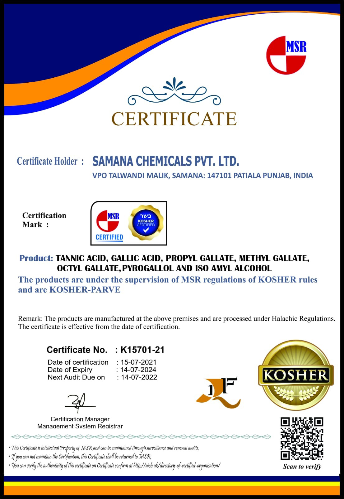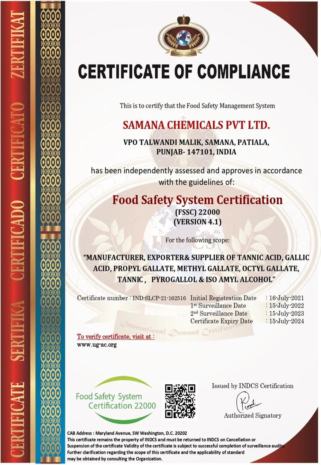 These certifications reflect Samana Chemicals’ dedication to quality, safety, and global market compliance, making us a trusted partner across pharmaceuticals, food, feed, and industrial sectors.